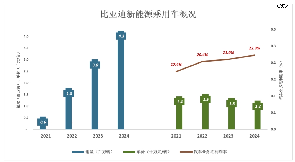 比亚迪是第 一种结局:毛利润——从2021年的195.6亿增至2024年的1377.2、增幅超过600%;毛利润率从2021年的17.4%增至 2024年的22.3%、累积提高4.9个百分点。
