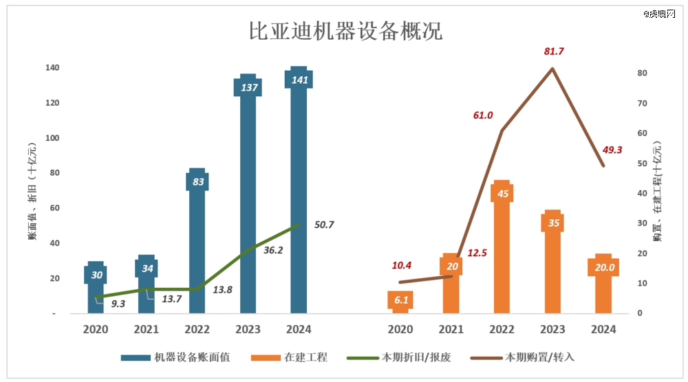 截至2024年末,机器设备账面值为1412亿(原值2496亿),单班产能428万辆/年(部分基地双班,年产可突破600万)。按比亚迪的折旧策略,轻松支撑600万辆年销量的产量,还有两年半净折旧完毕!#友商还在为60万、100万产能筹集资金#