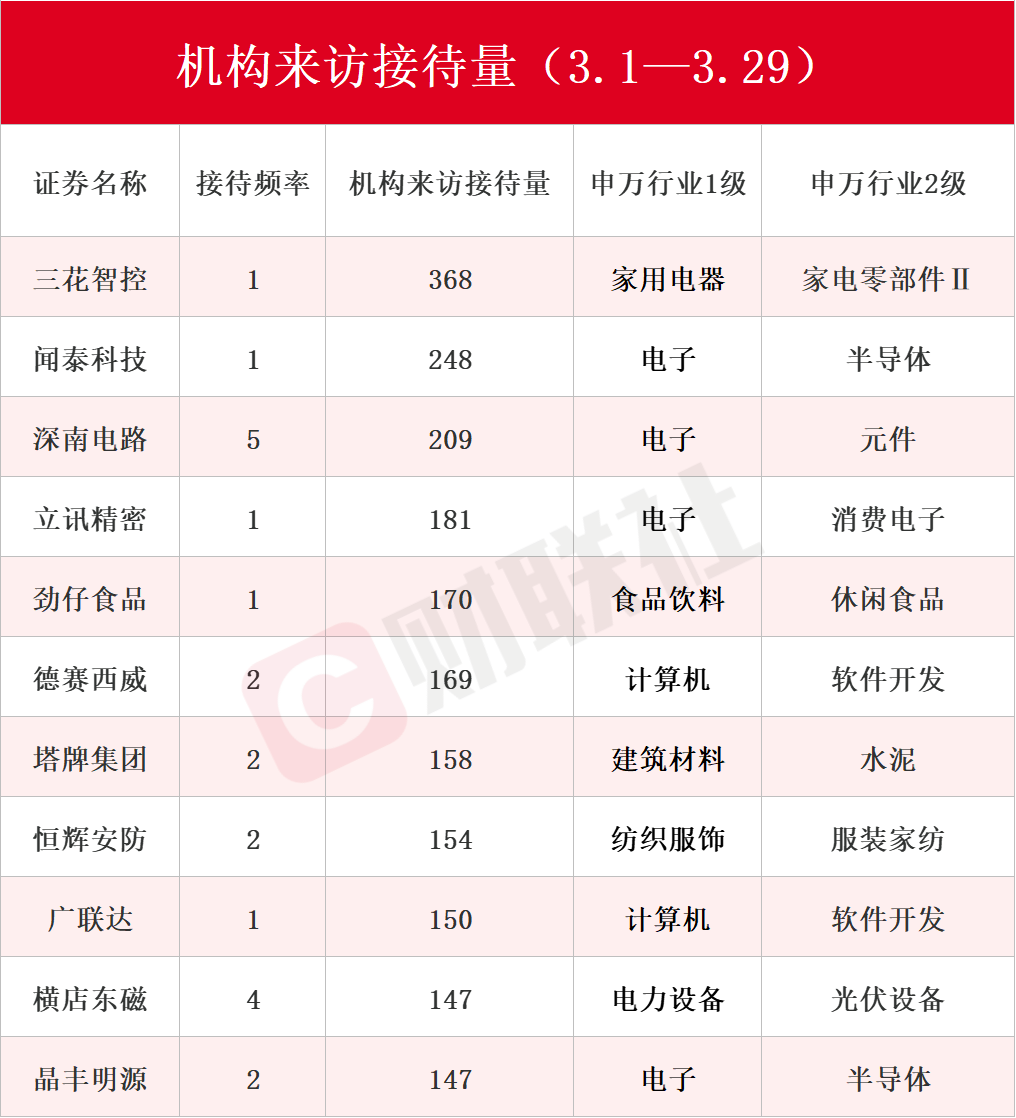 按机构来访接待量统计,三花智控、闻泰科技、深南电路、立讯精密、劲仔食品、德赛西威、塔牌集团、恒辉安防、广联达、横店东磁和晶丰明源接待量位列前十。前三名三花智控、闻泰科技、深南电路机构来访接待量分别达368家、248家、209家,具体详见下图:
