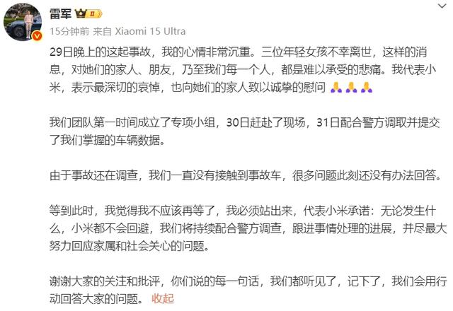 随后,小米创办人,董事长兼CEO雷军表示,“29日晚上的这起事故,我的心情非常沉重。三位年轻女孩不幸离世,这样的消息,对她们的家人、朋友,乃至我们每一个人,都是难以承受的悲痛。我代表小米,表示最深切的哀悼,也向她们的家人致以诚挚的慰问。”