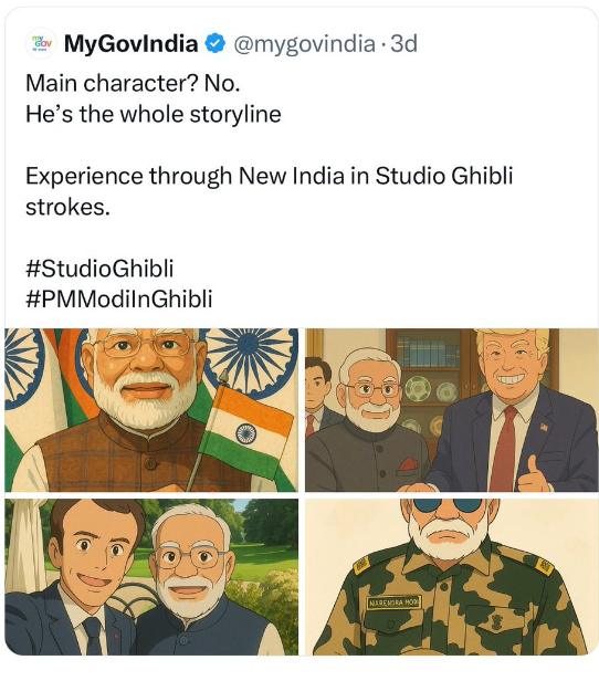 澳大利亚“对话”网站1日报道称,这股吉卜力风潮始于OpenAI内部,随后席卷硅谷工程师圈,甚至传播到了政界。例如,上周白宫官方社交账号发布了一张吉卜力风格照片,画中一名妇女被美国移民与海关执法局抓捕,正在哭泣。据新德里电视台报道,印度政府日前在社交媒体X上发布了数张画有总理莫迪的吉卜力风格图片,其中包括莫迪与美国总统特朗普、法国总统马克龙的会晤场景照(如图)。
