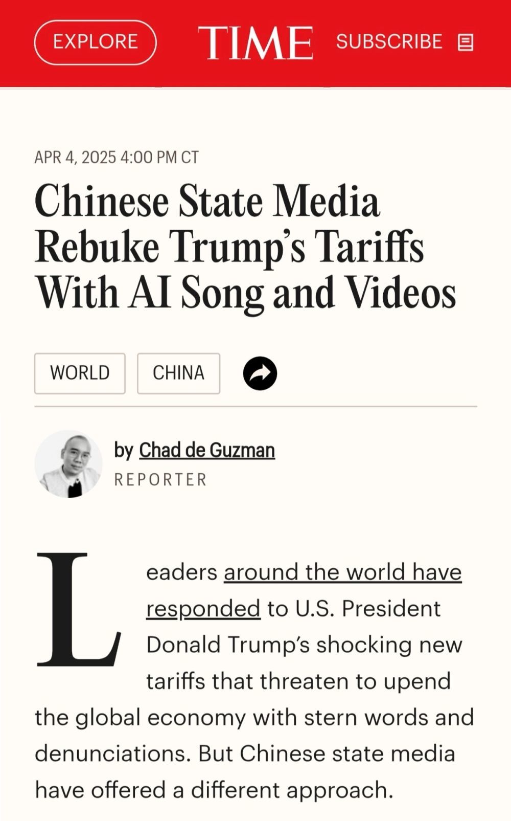 近日,美国《时代》周刊网站刊登一篇题为《中国国家媒体用AI歌曲和视频抨击特朗普关税政策》的文章,关注到了新华社发布的一部AI科幻短片《塔·里·夫》。