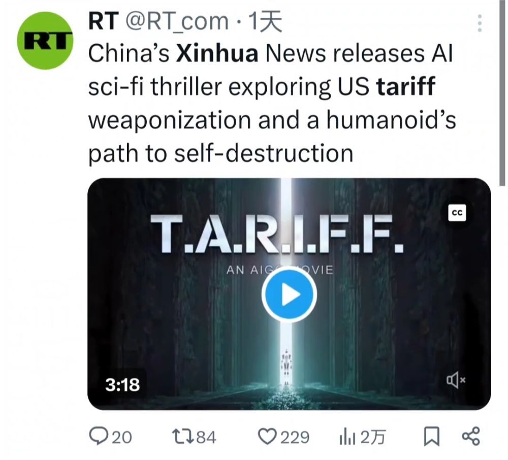 在新华社发布这部AI科幻短片次日,“今日俄罗斯”海外社交媒体转发了这部短片,并介绍道:“中国的新华社发布AI科幻惊悚片,探讨美国关税的武器化和一个人形机器人的自毁之路。”