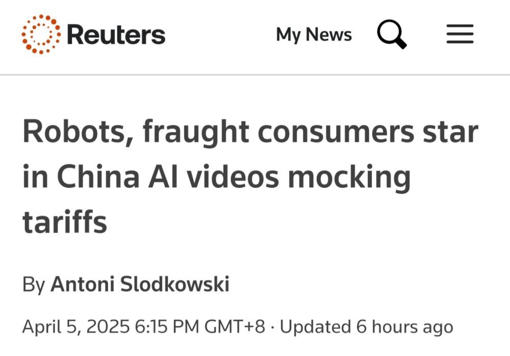 英国路透社也在一篇报道中谈到,新华社的海外社交媒体播发了一段由AI生成的视频,“视频中,一个名为 ‘塔·里·夫’的机器人没有听从创造者的命令征收将带来 ‘贸易战和动荡 ’的高关税,并选择了自毁。”