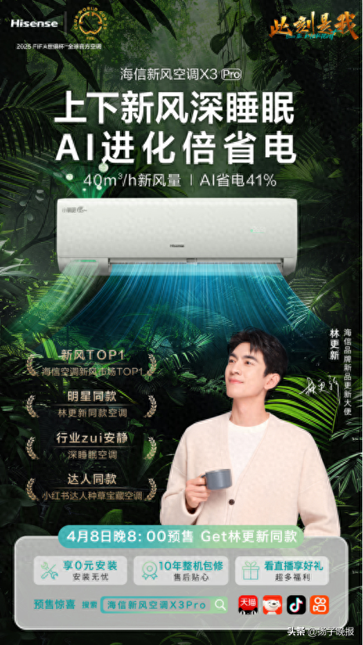 4月8日,2025年FIFA世俱杯全球官方空调——海信新风空调X3Pro挂机正式开启预售。这款新品不仅以行业首创的双新风口对流技术和AI省电41%两大核心科技引发行业热议,在2025AWE展上吸引了包括国际足球巨星萨内蒂、奥运冠军陈梦、搜狐创始人张朝阳等多位大咖的驻足体验与点赞。更因为“林更新同款空调”的热搜标签,进一步点燃消费者期待。