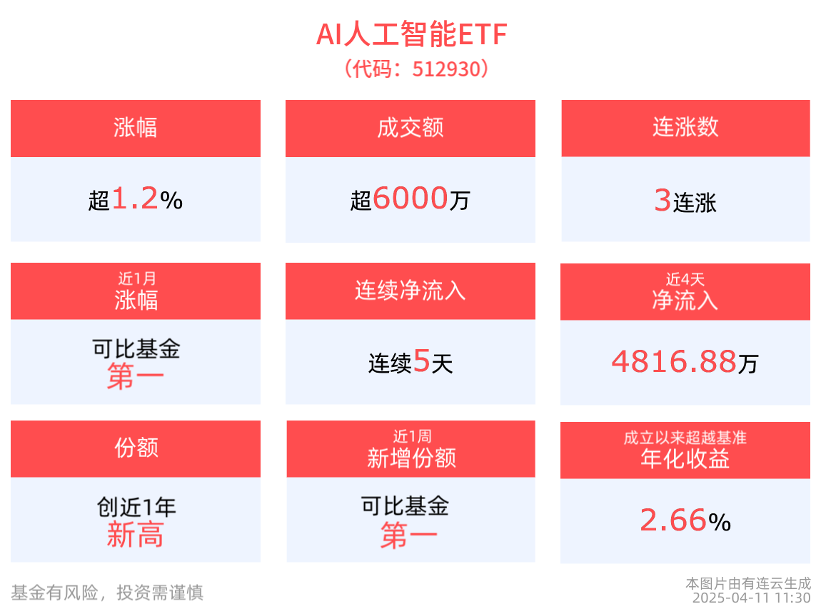 截至2025年4月11日早盘收盘,中证人工智能主题指数(930713)强势上涨1.52%,成分股芯原股份(688521)上涨10.57%,全志科技(300458)上涨7.45%,澜起科技(688008)上涨7.17%,恒玄科技(688608),北京君正(300223)等个股跟涨。AI人工智能ETF(512930)上涨1.29%, 冲击3连涨。最新价报1.25元。拉长时间看,截至2025年4月10日,AI人工智能ETF近3月累计上涨1.64%,涨幅排名可比基金1/3。