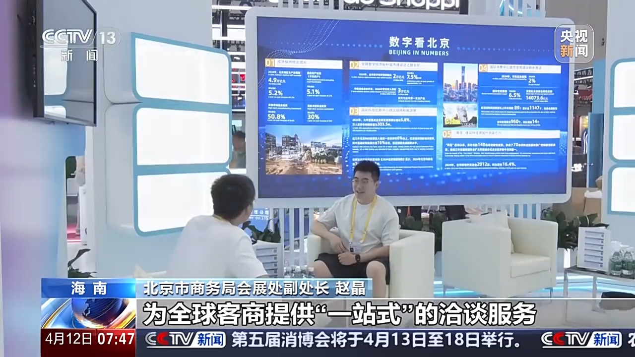 北京市商务局会展处副处长 赵晶:他们带来了老字号、文创产品、首发首秀科技产品,还有人工智能产品。同时在展区内,我们搭建了投资北京会客厅洽谈区域,为全球客商提供“一站式”的洽谈服务。