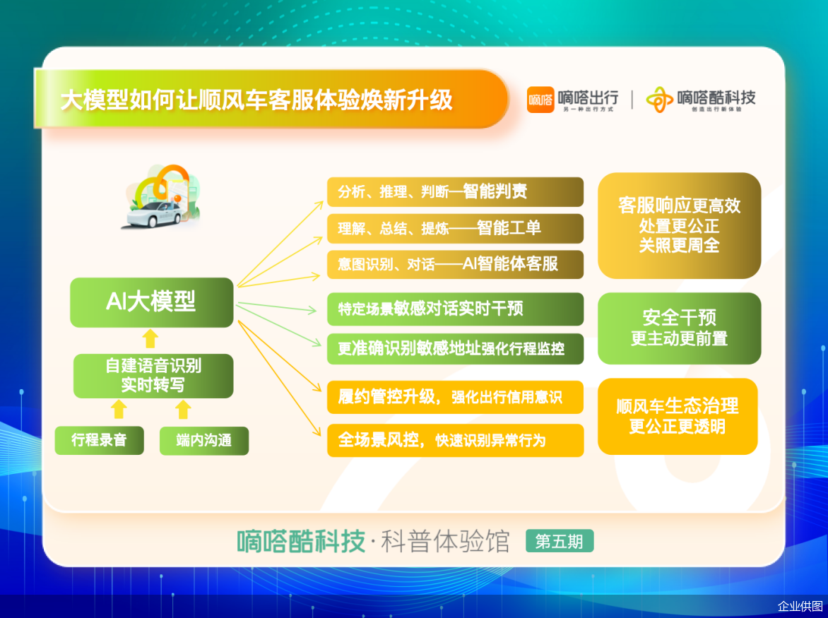 同时,基于自建语音识别能力,嘀嗒出行已将大模型应用到系统智能判责、智能工单生成、敏感对话干预、履约管控、异常行为识别干预等多个方面,大幅提升了客服效率同时让安全干预更主动,顺风车生态治理更加公正透明。