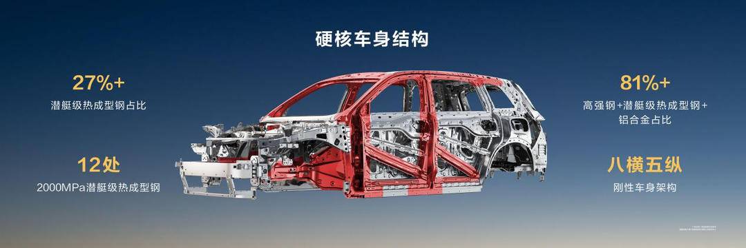 被动安全方面,问界M8采用“八横五纵”笼式车身,铝合金+高强度钢+热成型钢占比达81%,前乘员舱核心骨架结构100%采用潜艇级热成型钢。加厚加强双层超长A柱采用2000MPa超高强度热成型钢,铝合金一体化后地板采用9800吨一体压化压铸工艺,配合9安全气囊+16安全点位设计,以及主动式安全带+双预紧式安全带,带来一排、二排、三排都安全的超五星安全体验。