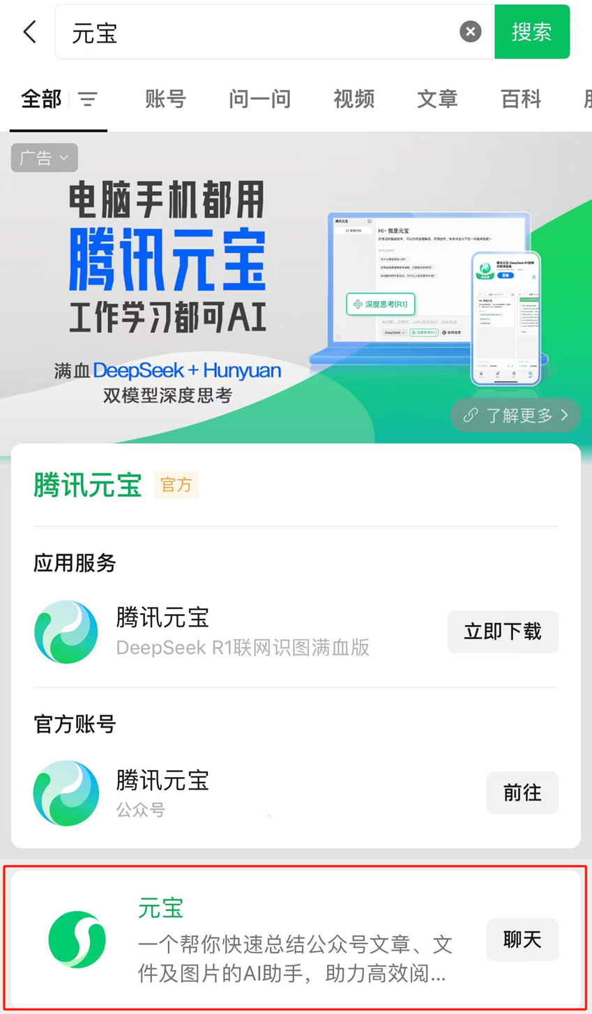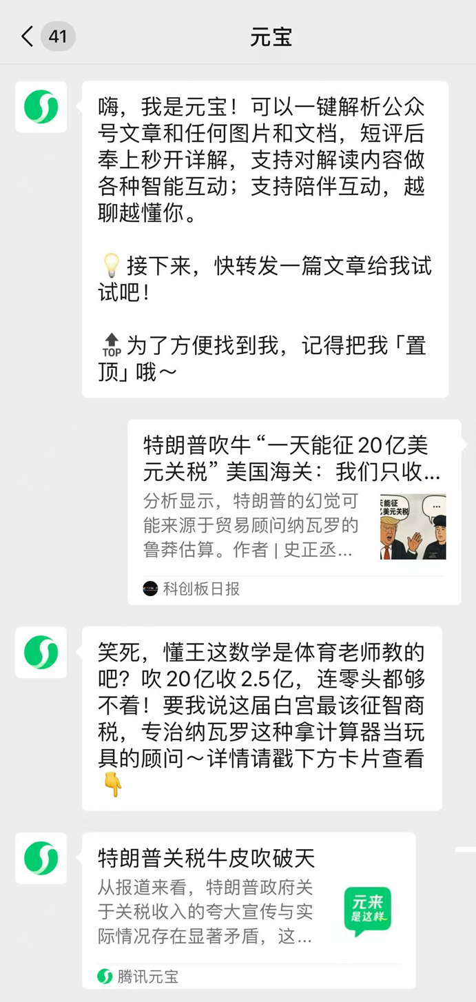 日前,微信上线新功能,用户可以在微信搜索“元宝”之后,将其添加为好友,直接在微信聊天界面与其进行互动。官方介绍显示,其“搭载混元和DeepSeek双模引擎,无缝衔接微信生态。一键解析公众号文章和任何图片和文档,短评后奉上秒开详解,支持对解读内容做各种智能互动。”