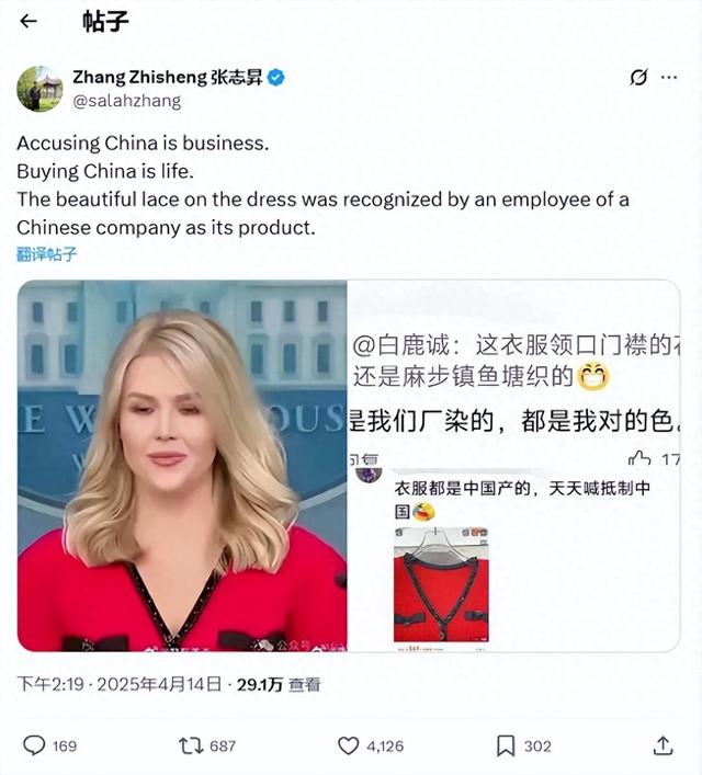 4月14日,中国驻登巴萨总领事张志昇在社交平台上发文并配图点出白宫新闻发言人卡罗琳·莱维特的着装系中国制造。