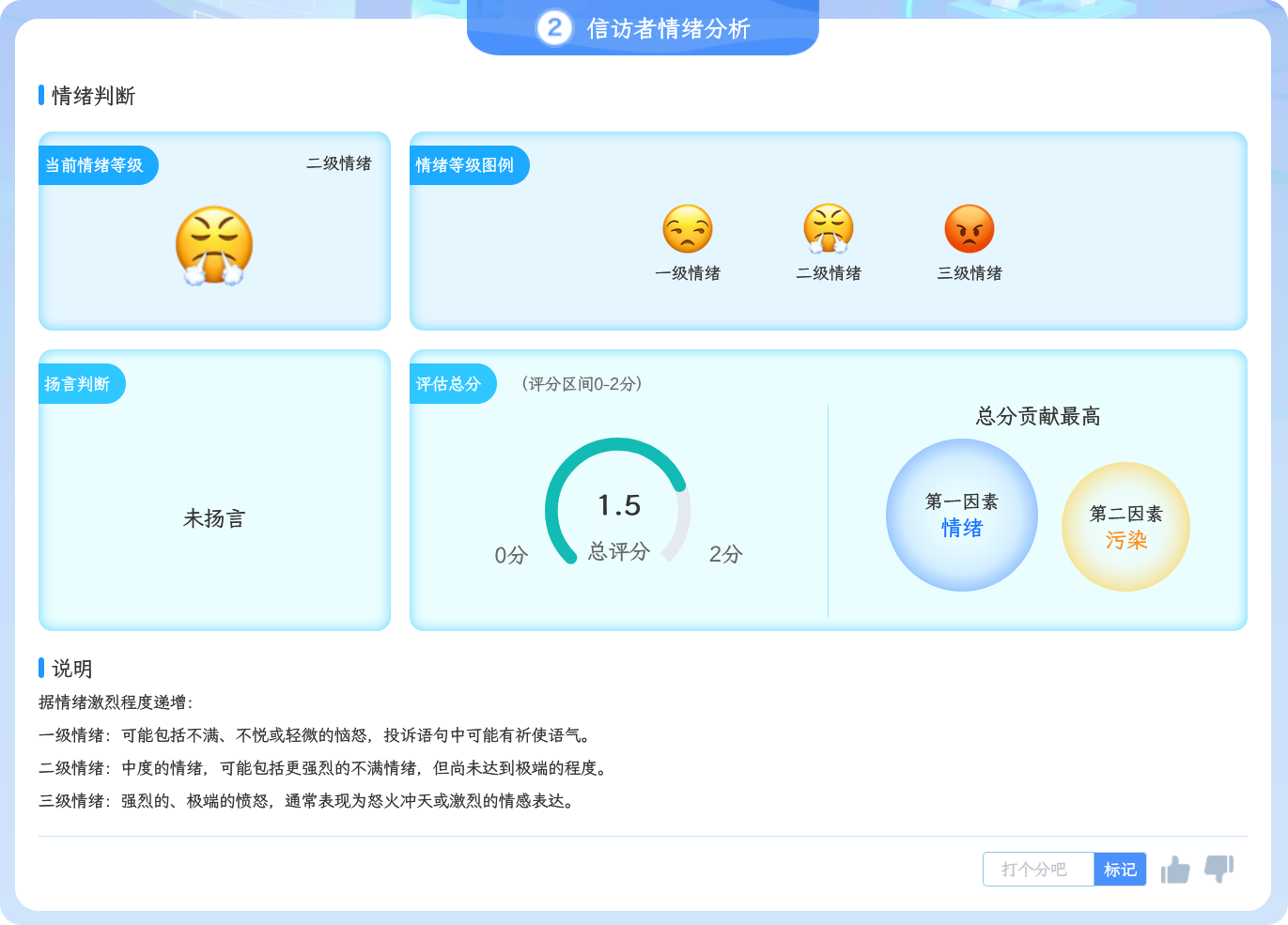 “这个红色的表情是三级情绪,表示信访事项显示得情绪比较强烈,信访部门需要重点关注。”郑柏立指着系统上的情绪等级研判向记者介绍说,系统可以根据来信来电内容、措辞、语气等,对信访事项潜在社会风险等级予以判别并给出重点导办意见。同时通过对海量生态环境信访事项进行实时监测,及时掌握信访形势发展动态,掌握极端事件出现的苗头,从源头上对信访发展可能性提供预判辅助,以有效、及时化解重大环境矛盾纠纷。