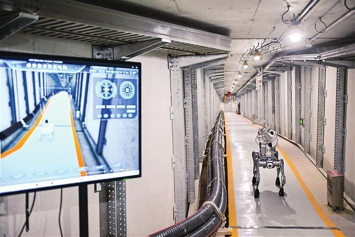 近年来,国网雄安新区供电公司累计投资110亿元,投运500千伏雄东站等31项重点工程,新建、改造35千伏以上线路210.5公里,建成城市智慧能源融合站、5G智慧电缆隧道等标志性工程。图为四足巡检机器人在雄安新区雄东电缆隧道内巡检。 新华社记者 牟 宇 摄