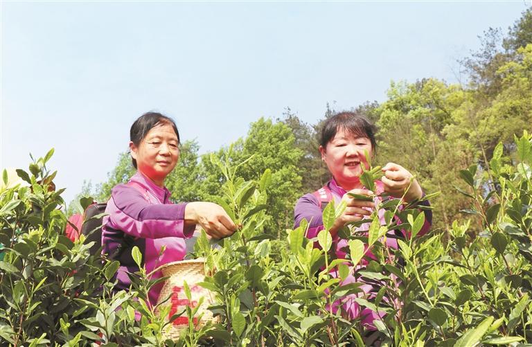 图为普安县老年大学组织老干部到茶源街道细寨村助农采茶。