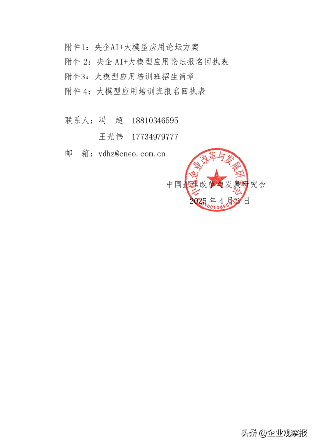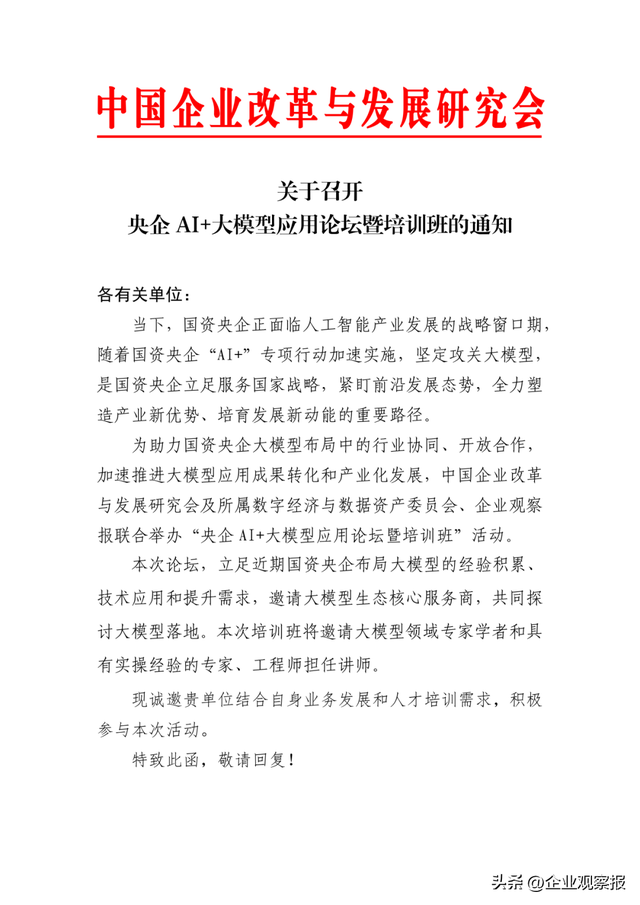为助力国资央企大模型布局中的行业协同、开放合作,加速推进大模型应用成果转化和产业化发展,中企研数字经济与数据资产工委会和企业观察报社将联合承办“央企AI+大模型应用论坛暨培训班”活动。