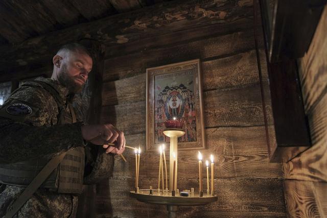 当地时间2025年4月20日,俄罗斯国防部新闻服务处发布的视频中,俄国士兵在乌克兰一个未指定地点点燃蜡烛,庆祝复活节。