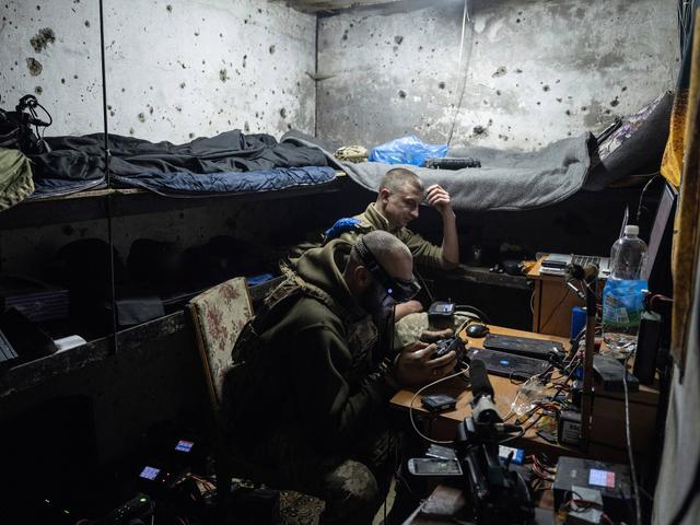 当地时间2025年4月19日,顿涅茨克地区康斯坦丁诺夫卡,乌克兰士兵在避难所内操作FPV无人机。