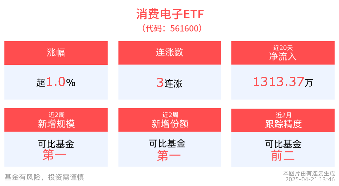 份额方面,消费电子ETF近2周份额增长300.00万份,实现显著增长,新增份额位居可比基金1/5。