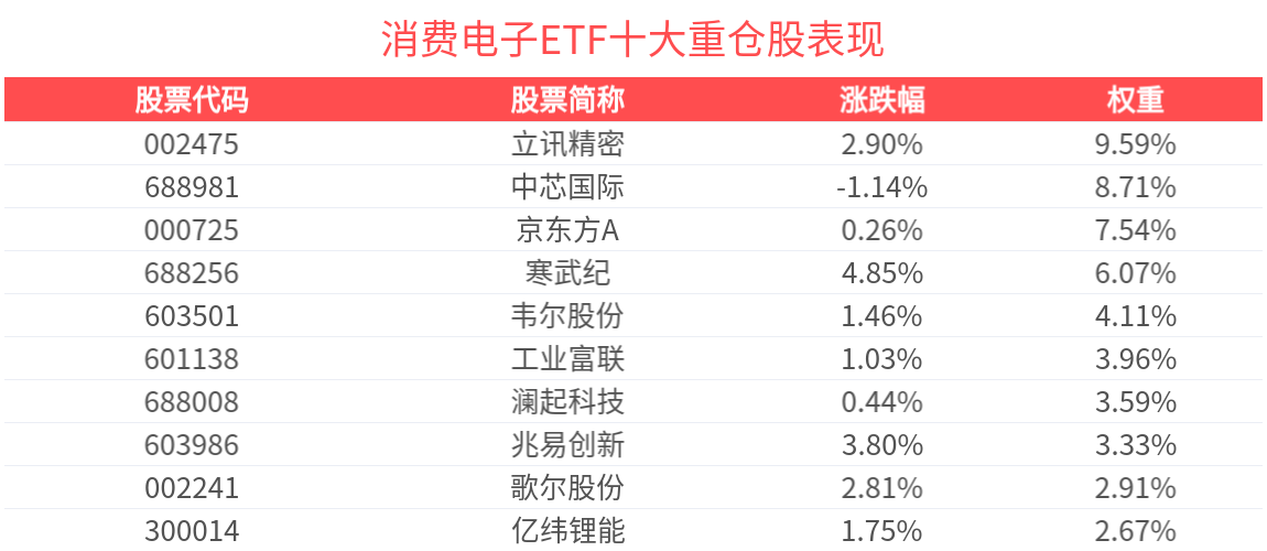 消费电子ETF紧密跟踪中证消费电子主题指数,中证消费电子主题指数选取50只业务涉及元器件生产、整机品牌设计及生产等消费电子相关的上市公司证券作为指数样本,以反映消费电子主题上市公司证券的整体表现。