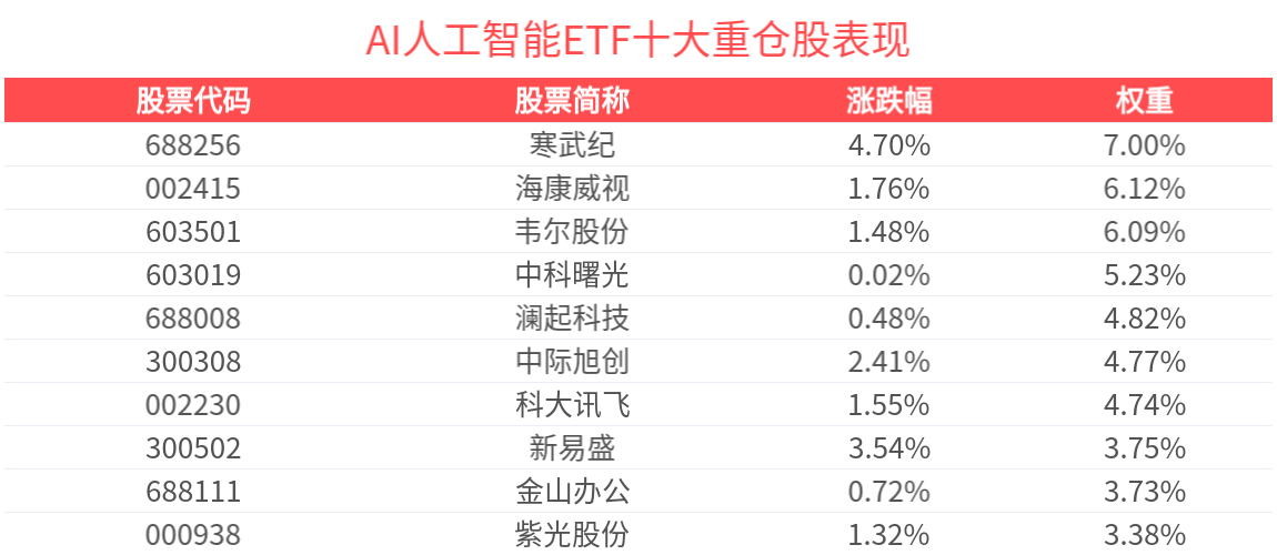 数据显示,截至2025年3月31日,中证人工智能主题指数(930713)前十大权重股分别为寒武纪(688256)、海康威视(002415)、韦尔股份(603501)、中科曙光(603019)、澜起科技(688008)、中际旭创(300308)、科大讯飞(002230)、新易盛(300502)、金山办公(688111)、紫光股份(000938),前十大权重股合计占比49.82%。