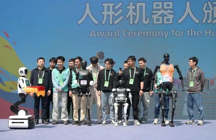 2025年4月19日,一台机器人在人形机器人颁奖仪式上托举着奖牌走向获奖机器人选手和技术团队。当日,2025北京亦庄半程马拉松暨人形机器人半程马拉松举行。新华社记者 李贺 摄