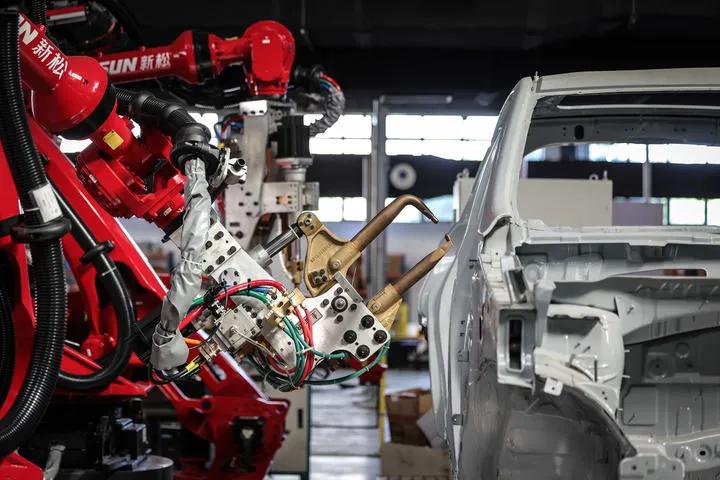 2024年6月3日拍摄的点焊机器人。机器人被广泛应用于工业,它们能够胜任繁重、危险或复杂的工作,提高生产效率和经济效益。新华社记者 潘昱龙 摄