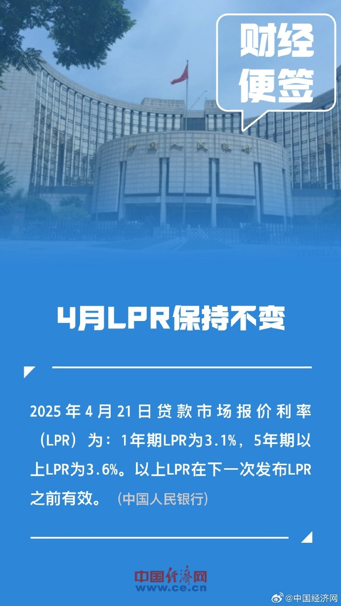 中国人民银行授权全国银行间同业拆借中心公布,2025年4月21日贷款市场报价利率(LPR)为:1年期LPR为3.1%,5年期以上LPR为3.6%。以上LPR在下一次发布LPR之前有效。