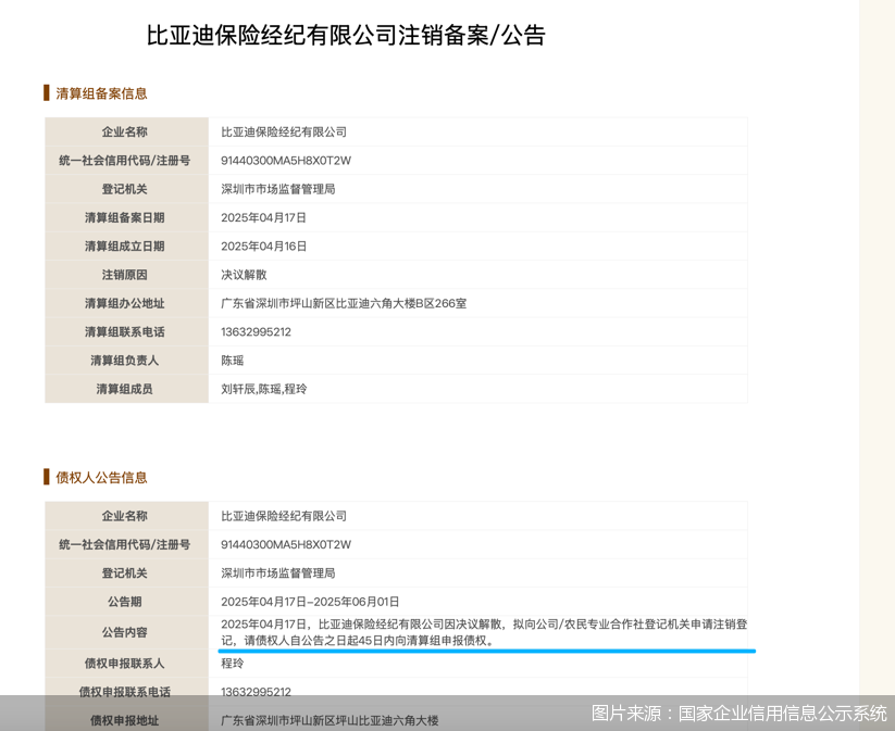 国家企业信用信息公示系统日前披露的信息显示,比亚迪保险经纪于4月17日发布注销公告,原因为“决议解散”,注销公告期截至6月1日。