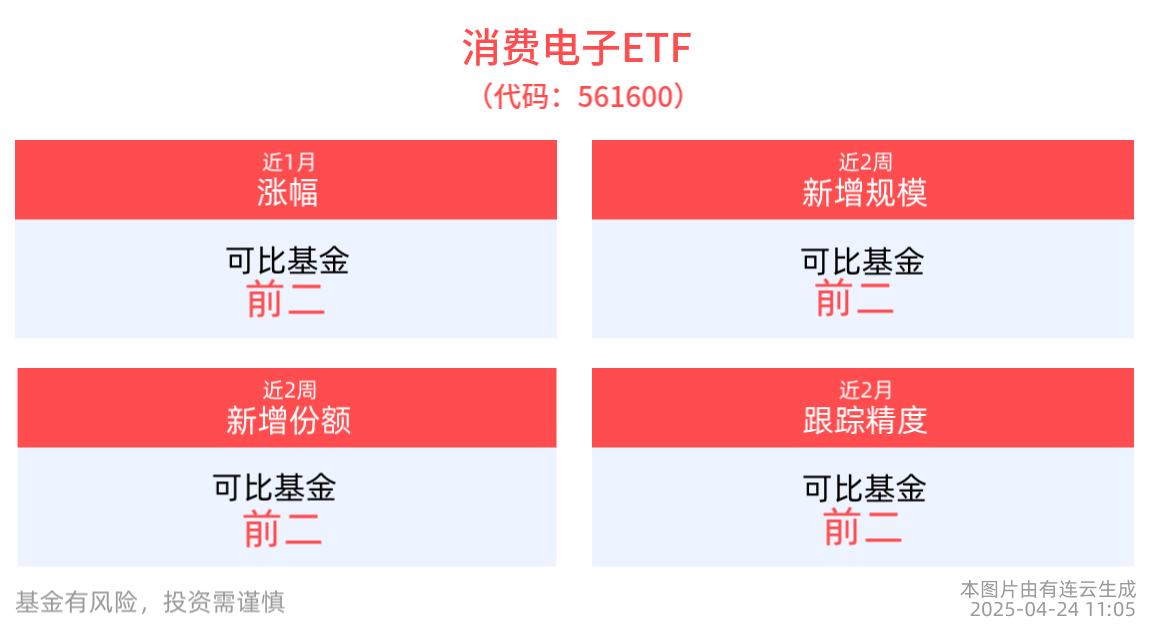 截至2025年4月23日,消费电子ETF近1周累计上涨2.37%,涨幅排名可比基金2/5。