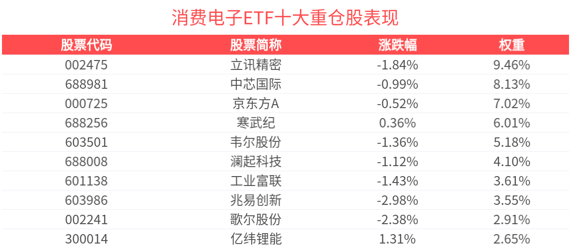 数据显示,截至2025年3月31日,中证消费电子主题指数(931494)前十大权重股分别为立讯精密(002475)、中芯国际(688981)、京东方A(000725)、寒武纪(688256)、韦尔股份(603501)、澜起科技(688008)、工业富联(601138)、兆易创新(603986)、歌尔股份(002241)、亿纬锂能(300014),前十大权重股合计占比53.05%。
