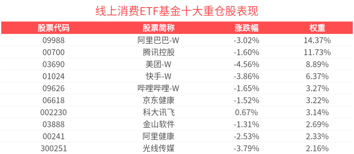 数据显示,截至2025年3月31日,中证沪港深线上消费主题指数(931481)前十大权重股分别为阿里巴巴-W(09988)、腾讯控股(00700)、美团-W(03690)、快手-W(01024)、科大讯飞(002230)、哔哩哔哩-W(09626)、京东健康(06618)、金山软件(03888)、光线传媒(300251)、昆仑万维(300418),前十大权重股合计占比57.55%。