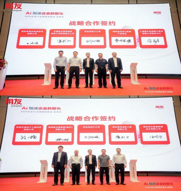 现场,在众多嘉宾的见证下,用友网络陕西分公司分别与中国联通集团政企客户事业群陕西省分部、陕西省区域大数据产业协会 、西安希格玛投资咨询有限公司、上海浦东发展银行股份有限公司西安分行、陕西新丝路集团(股份)有限公司、西安莱特信息工程有限公司、陕西交通电子工程科技有限公司、西安柏云智能数据技术有限公司签署战略合作协议,此次签约标志着用友网络陕西分公司与生态战略伙伴们,将在陕西省数智化标杆孵化、云服务联合解决方案、智能制造行业数转等方面展开深度合作。未来,用友网络陕西分公司将与生态伙伴们共筑数智化“朋友圈”,携手助力陕西企业跑出数智化“加速度”!