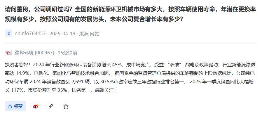 4月27日,盈峰环境(000967)在互动平台上表示,2024年行业新能源环保装备逆势增长45%,成市场亮点。受益“双碳”战略及政策驱动,行业新能源渗透率达14.9%,电动化、氢能化与智能技术融合加速。车辆强制险上险数据显示,公司纯电动环保车辆2024年销售数量达2,691辆,以30.5%市占率连续三年占据行业排名第一。2025年一季度销量同比大幅增长117%,市场份额升至35%,排名第一。