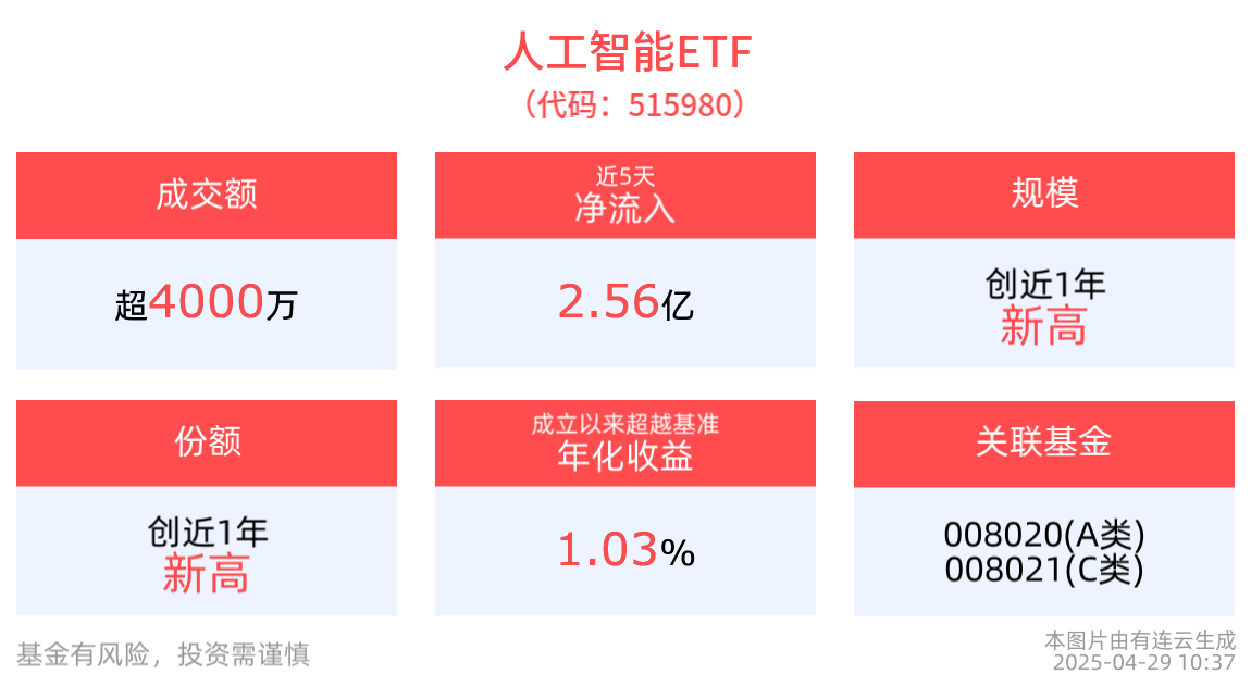 流动性方面,人工智能ETF盘中换手1.36%,成交4533.93万元。规模方面,人工智能ETF最新规模达33.28亿元,创近1年新高。份额方面,截至4月28日,人工智能ETF近1月份额增长超5.6亿份,最新份额达35.40亿份,创近1年新高。