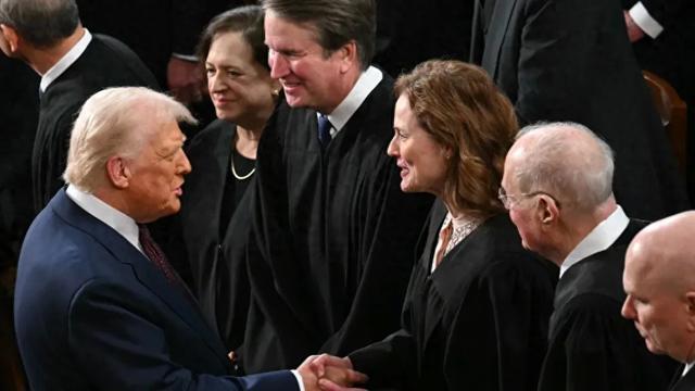 3月4日,特朗普抵达华盛顿特区美国国会大厦众议院会议厅,准备向国会联席会议发表讲话时,与美国最高法院大法官们握手。