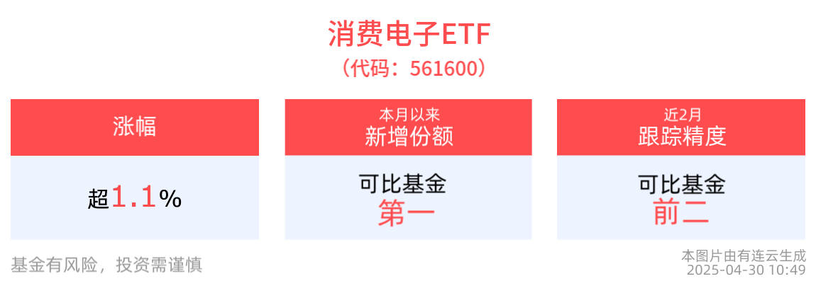 流动性方面,消费电子ETF盘中换手1.62%,成交278.57万元。拉长时间看,截至4月29日,消费电子ETF近1月日均成交1707.53万元,排名可比基金前2。