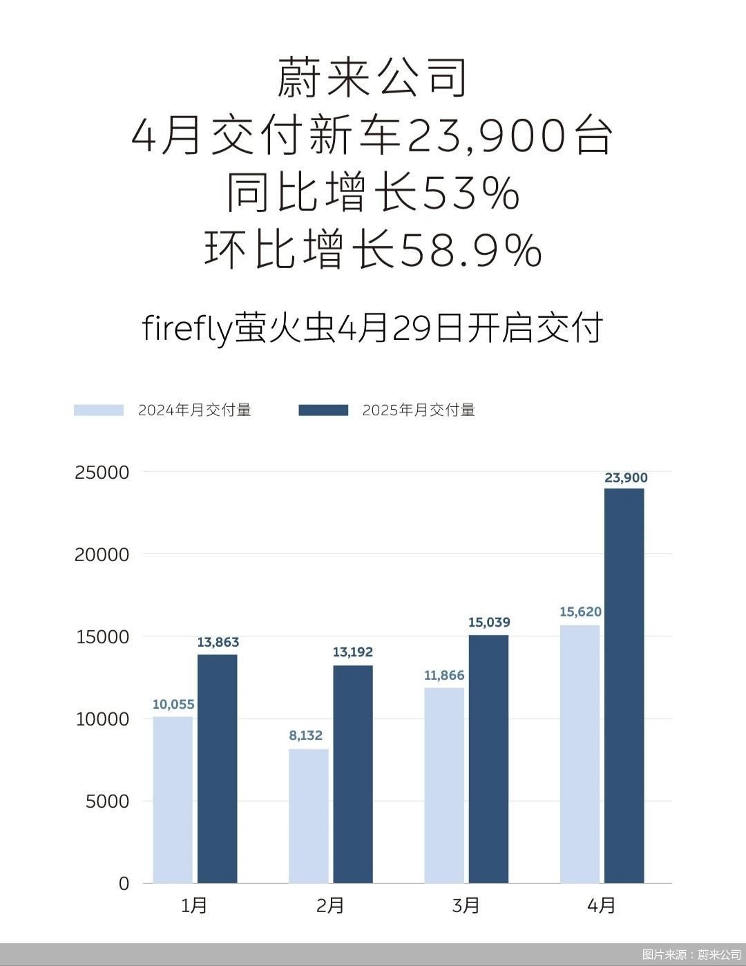 北京商报讯(记者 刘晓梦)5月1日,蔚来公司发布的数据显示,今年4月交付新车2.39万辆,同比增长53%,环比增长58.9%。其中,蔚来品牌交付新车1.93万辆、乐道品牌交付新车4400辆。