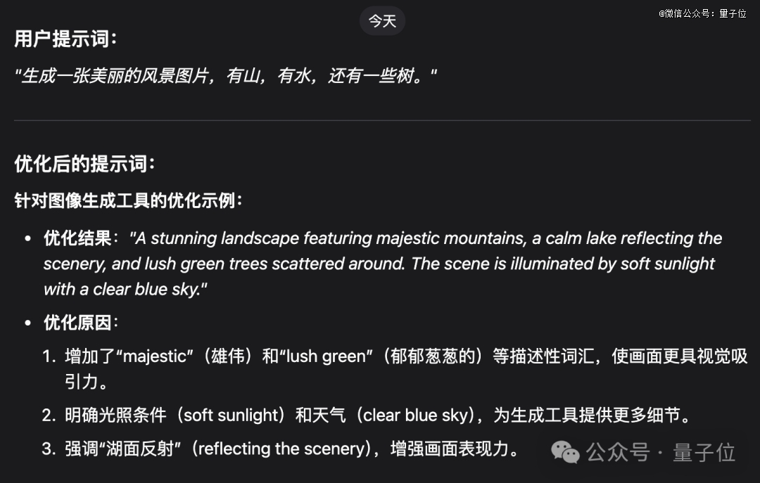 又或者,它会自动对用户的问题进行提示词优化。比如结合上下文、增加细节等。