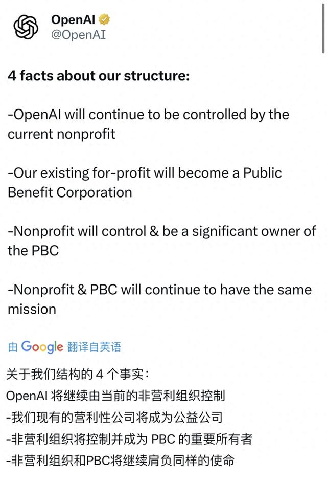 根据更新后的提案,OpenAI的营利性有限责任公司(for-profit LLC)将转变为像 Anthropic和xAI 这样的公益公司(Public Benefit Corporation,PBC)。