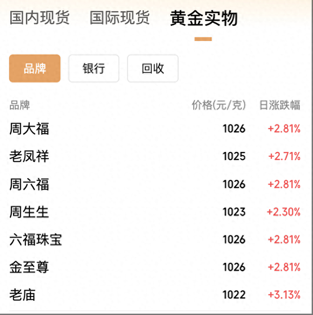 国内金饰价格也随之上扬,再度涨回千元人民币关口。5月6日,周大福足金饰品价格上调至1026元/克,较前日每克上涨28元;老凤祥足金饰品价格上调至1025元/克,较前日每克上涨27元。此外,周六福、六福珠宝、金至尊足金金饰品报价均为1026元/克,老庙足金金饰品报价1022元/克,周生生足金金饰品报价1023元/克。