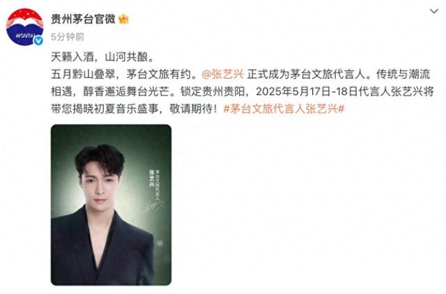 5月7日,贵州茅台官方号宣布:“张艺兴正式成为茅台文旅代言人,传统与潮流相遇,醇香邂逅舞台光芒”。