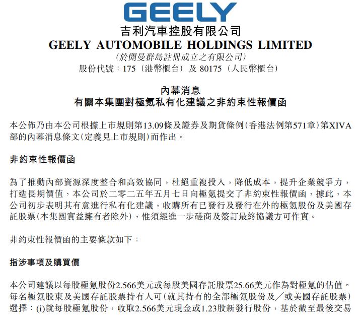 5月7日,吉利汽车(00175.HK)公告,公司于2025年5月7日向极氪提交非约束性报价函,建议私有化极氪,收购所有已发行及发行在外的极氪股份及美国存托股票(本集团实益拥有者除外)。建议购买价为每股极氪股份2.57美元或每股美国存托股票25.66美元。该价格较最后交易日美国存托股票于纽交所的收市交易价溢价约13.6%,较截至最后交易日止最后30个交易日期间美国存托股票于纽交所的成交量加权平均价格溢价20.0%。于公布日期,本集团持有极氪已发行及发行在外股本总额约65.7%。倘若私有化建议落实并完成,极氪将成为本公司的全资附属公司,实现私有化并于纽交所退市。