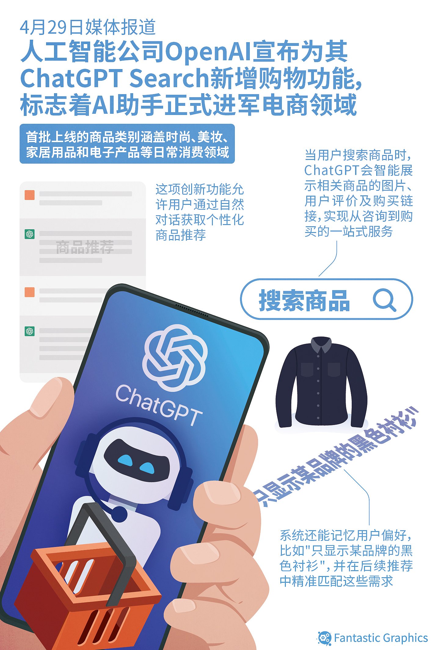 近日,ChatGPT 正式上线购物功能,支持用户通过自然语言对话完成商品搜索、比价与购买推荐。短短一周内,其购物相关搜索量激增 140%,首批覆盖的商品包括时尚、美妆、电子产品等品类。