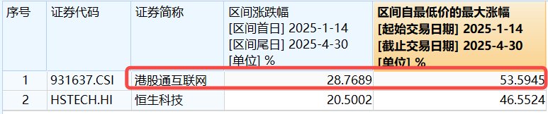 变局时刻,把握港股核心科网龙头。港股互联网ETF(513770)及其联接基金(A类 017125;C类 017126)被动跟踪中证港股通互联网指数,通过重仓港股互联网龙头,成为本轮港股科技行情的高效投资利器。数据显示,本轮行情启动以来至4月末,中证港股通互联网指数累计涨幅超28%,明显优于恒指、恒科指同期表现,区间最大涨幅更是高达53.59%,领涨弹性突出。