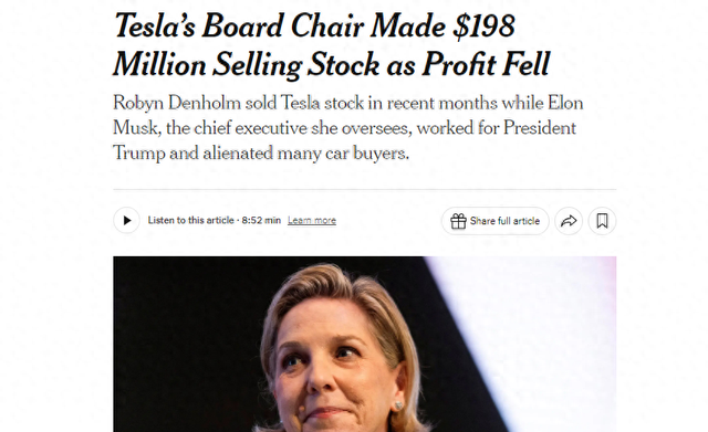 【环球网科技综合报道】5月14日,据《纽约时报》报道,特斯拉董事会主席罗宾·丹霍姆近日在特斯拉利润下滑之际,通过出售股票获利1.98亿美元,引发市场广泛关注。自2018年成为董事会主席以来,丹霍姆已通过出售特斯拉股票获利超过5.3亿美元。