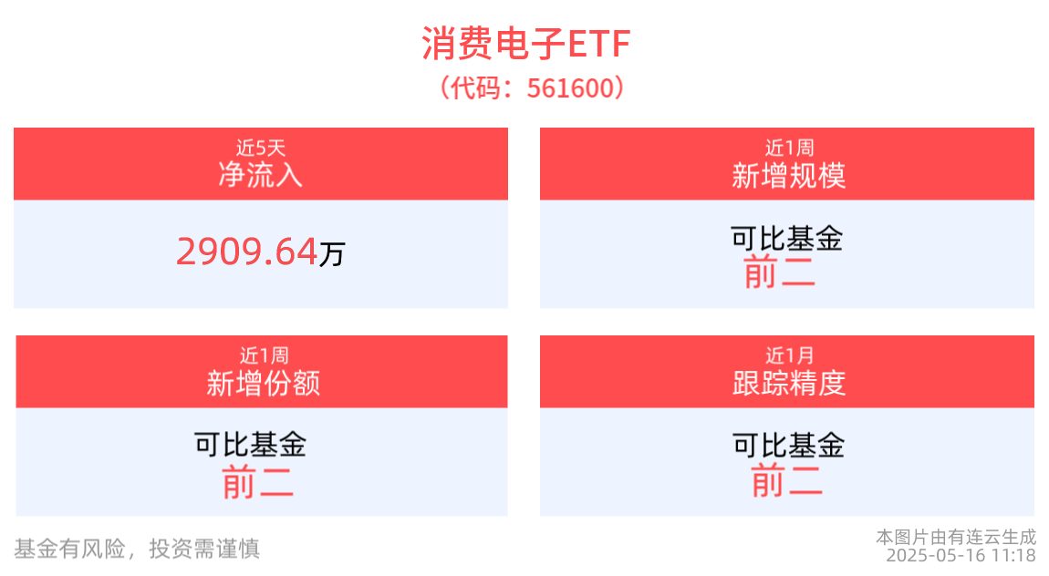 份额方面,消费电子ETF近1周份额增长3800.00万份,实现显著增长,新增份额位居可比基金2/5。