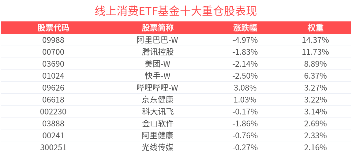 数据显示,截至2025年4月30日,中证沪港深线上消费主题指数(931481)前十大权重股分别为阿里巴巴-W(09988)、腾讯控股(00700)、美团-W(03690)、快手-W(01024)、科大讯飞(002230)、京东健康(06618)、哔哩哔哩-W(09626)、金山软件(03888)、拓维信息(002261)、阿里健康(00241),前十大权重股合计占比56.94%。