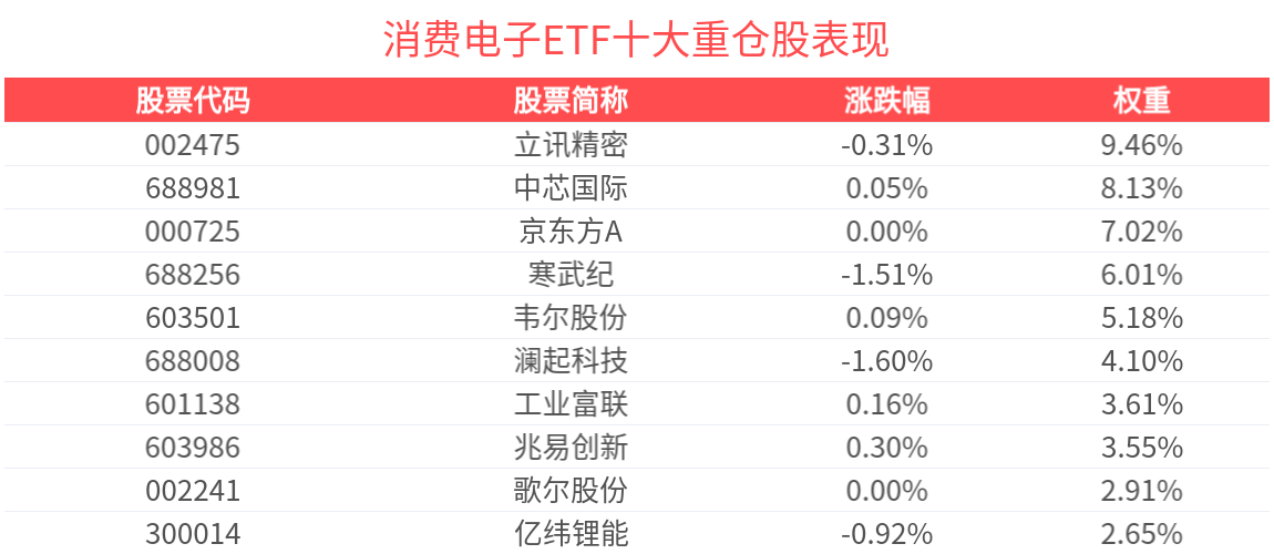 数据显示,截至2025年4月30日,中证消费电子主题指数(931494)前十大权重股分别为中芯国际(688981)、立讯精密(002475)、寒武纪(688256)、京东方A(000725)、韦尔股份(603501)、澜起科技(688008)、兆易创新(603986)、工业富联(601138)、歌尔股份(002241)、亿纬锂能(300014),前十大权重股合计占比53.78%。