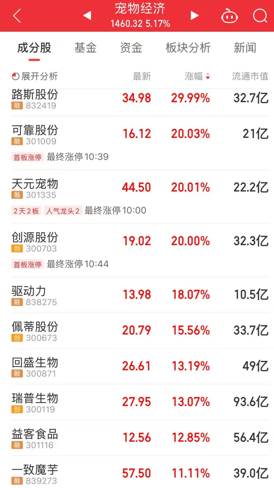 宠物经济板块中,天元宠物“20CM”涨停,迎来两连板。“谷子经济”板块中,曼卡龙、创源股份等个股大涨。