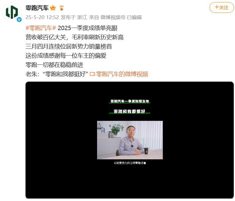图源:当事人账号不过,零跑汽车未能扭亏为盈,一季度公司权益持有人应占亏损为人民币1.3亿元,而2024年同期为亏损人民币10.1亿元。同比亏损收窄的主要原因是毛利改善水平高于费用开支的增加,环比亏损增加的主要原因是毛利总额的下降大于费用开支的下降。